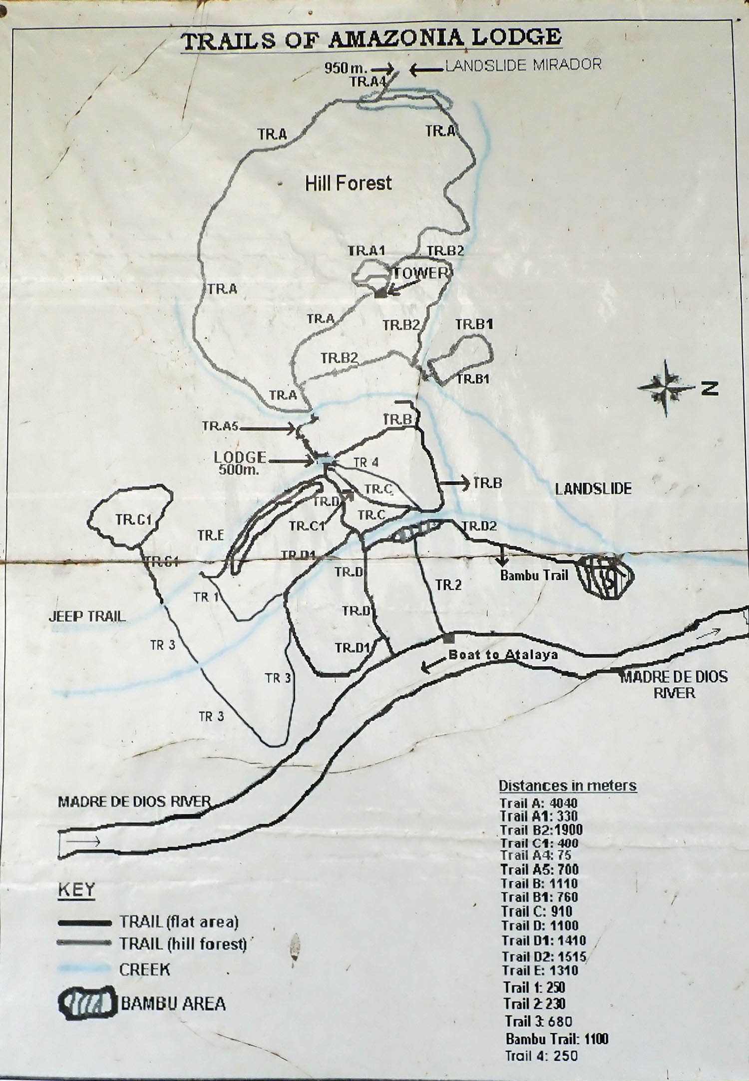 This lodge has a great variety of trails. Several go along the main river. Some go along wider 'bush roads'. Another trail climbs up several hundred metres and to a very tall and slightly wobbly canopy tower. There is also a oxbow lake like environment with a bamboo raft that can be sticked out.
