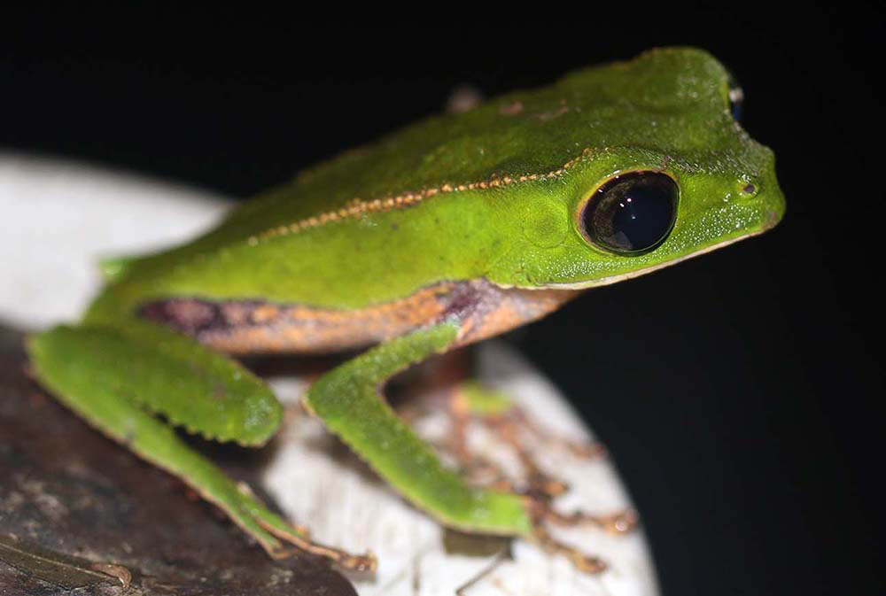 The family Hylidae incudes the classic tree frogs. As the name suggests, they are often found calling or climbing on branches in trees or bushes. Much of their morphology reflects this lifestyle; they are often green in colour, with long limbs for jumping, and large bulging eyes for judging distances. It is a large and widespread family across the tropics and warmer parts of the world, and they are split into several different sub-families that are sometimes treated at their own families, such as the Boana.