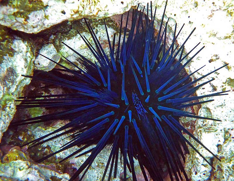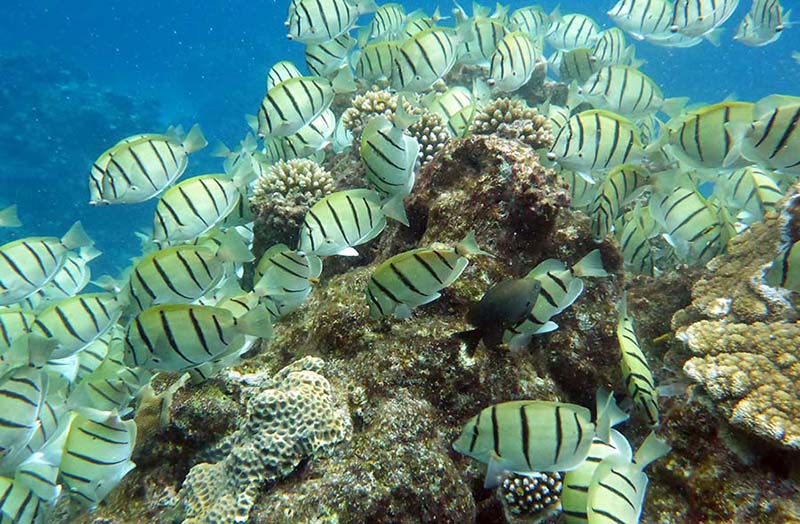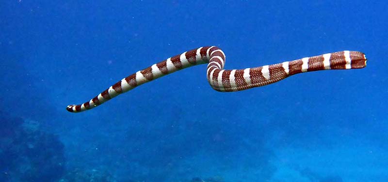 The most famous aspect of this reef are the number of sea kraits. If you stand on the main cement jetty near town, you will see kraits a couple of times an hour at least. If you snorkel for an hour or two, you should see at least a couple of sea kraits. These are slimmer than true sea snakes, and may be inquisitive, but they are not aggressive.