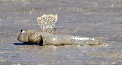 A blue spotted mudskipper with an erection...of it's dorsal fin.There are other marine invertebrates, including jellyfish (moving up the creek) various crustaceans, such as mud crabs, broad-fronted mangrove crabs (with purple carapace), and several species of fiddler crabs (the bright red flame fiddlers and others) ...
