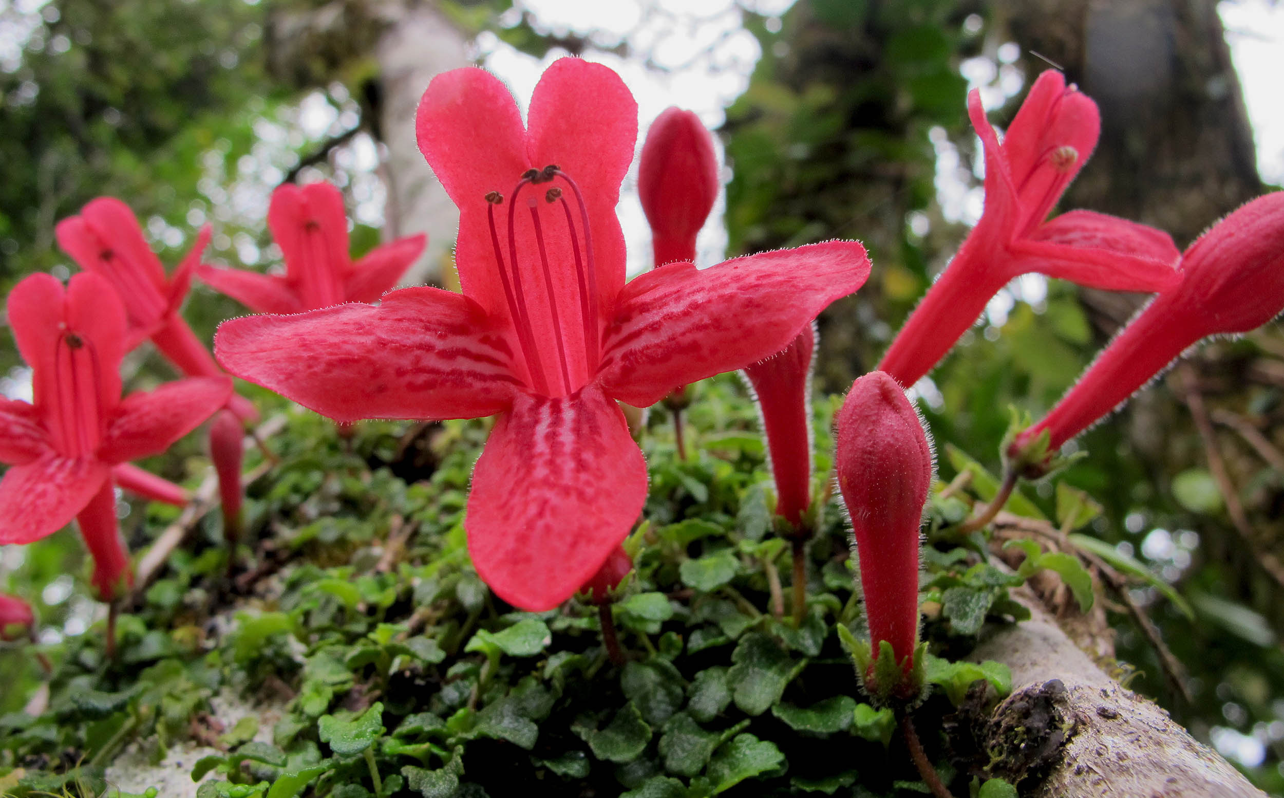 Asteranthera ovata, 'Estrellita' (Chilean fjords)One of the biggest red flowers is one of the symbols of these southern forests, the 'Chilean Bellflower' Lapageria rosea. The family that contains this species only has one other species: both are endemic to the temperate forests of southern South America.
